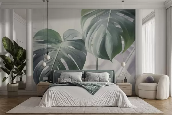 Papel tapiz Hojas de monstera texturizadas, grandes y verdes, sobre un fondo abstracto suave y claro. Nr. w09477