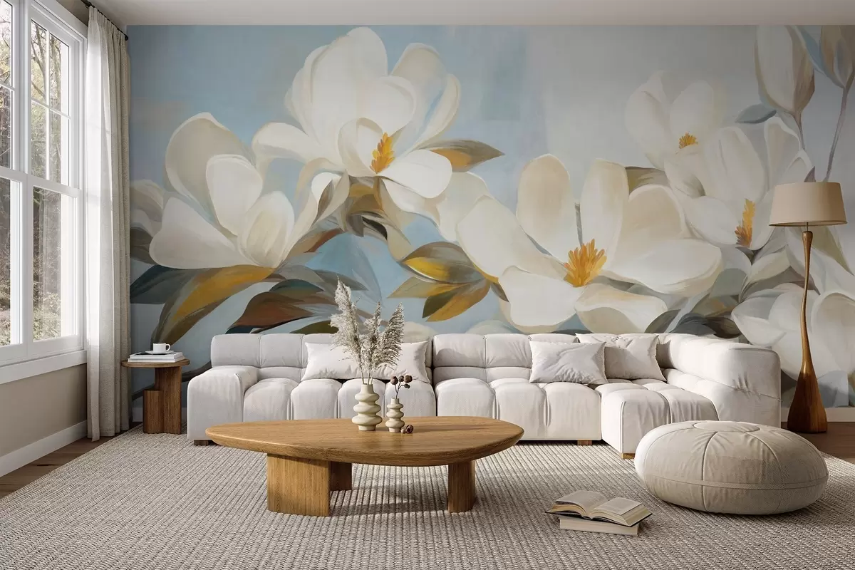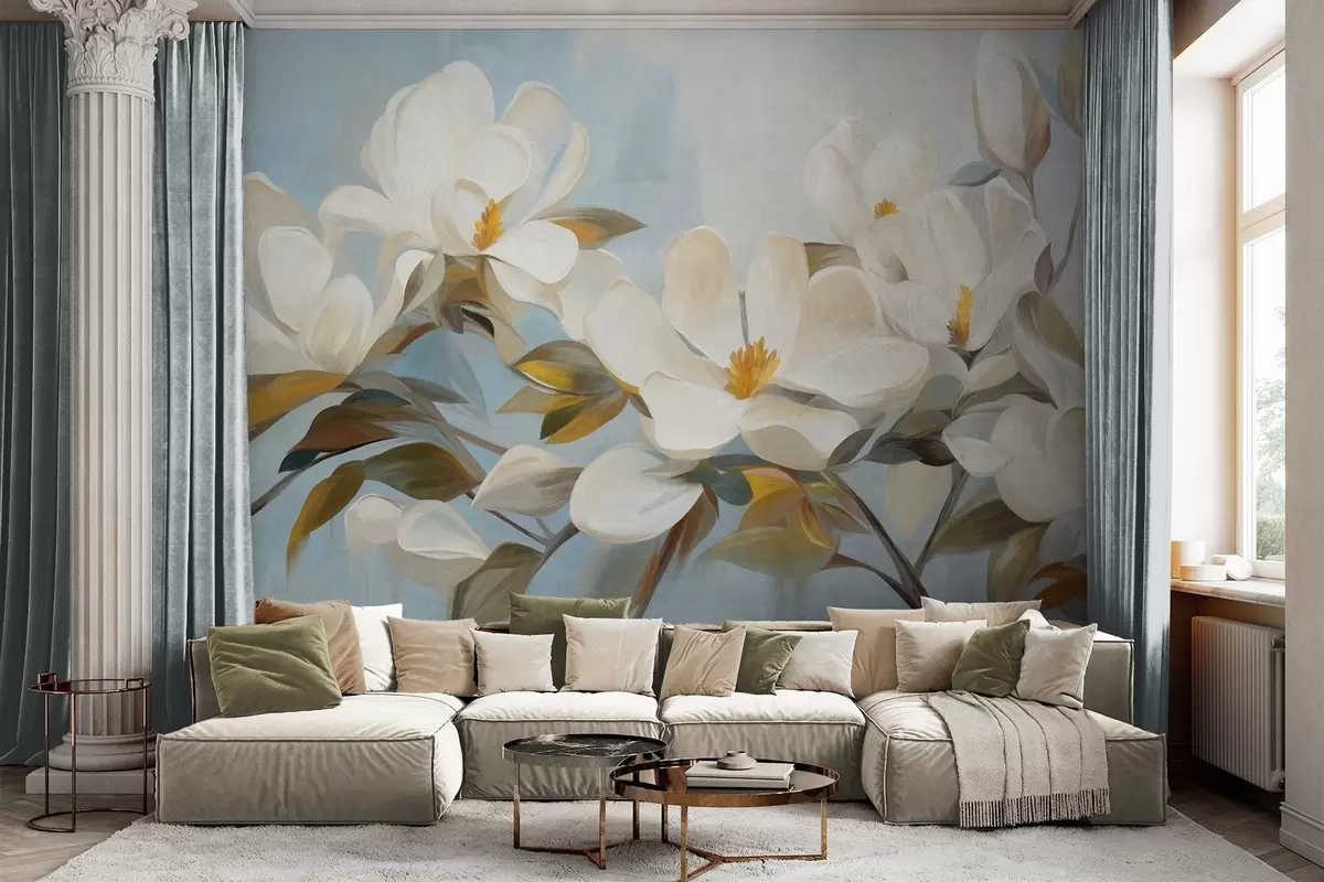 Papel tapiz Magnolias blancas con hojas verdes sobre fondo azul claro con imitación de pinceladas abstractas. Nr. w09478