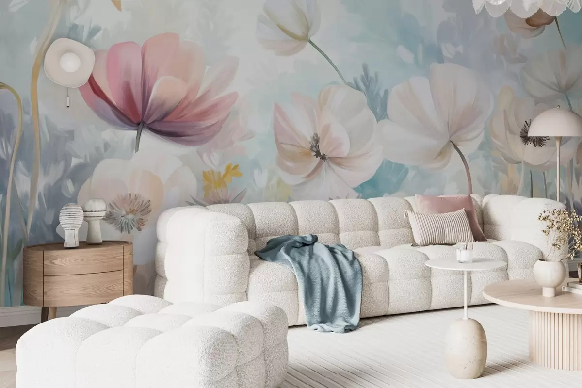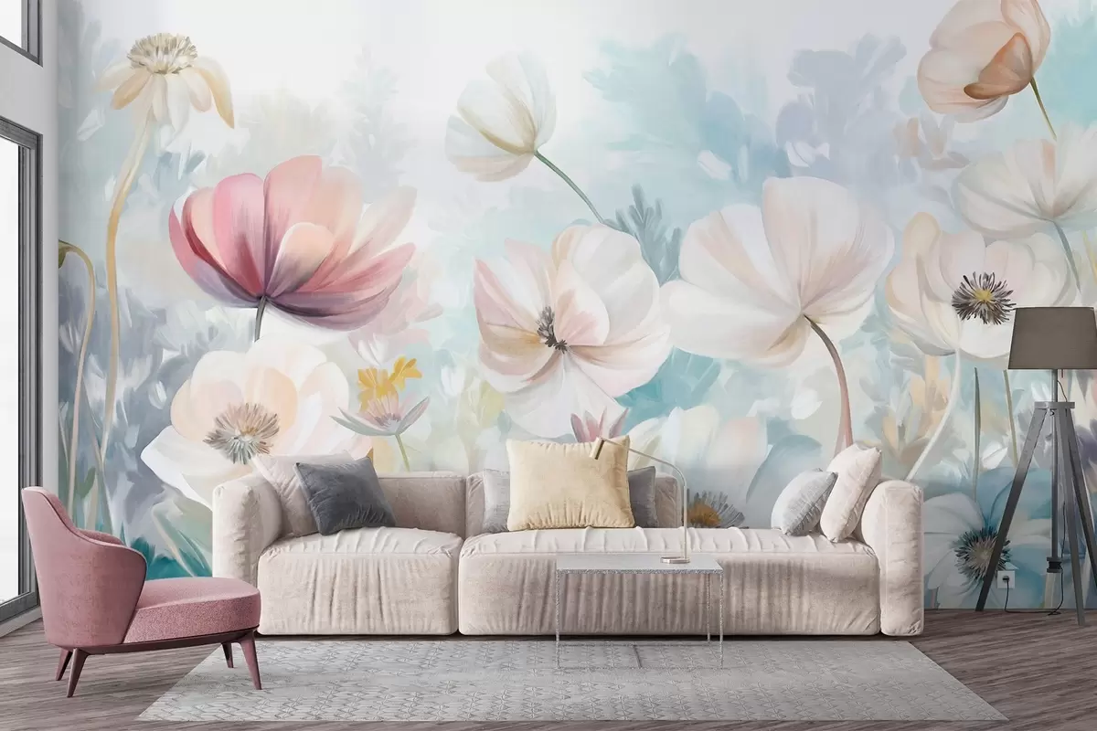 Papel tapiz Un campo de flores en tonos pastel con delicados pétalos y suaves hojas verdes, en un estilo acuarela onírico y texturizado Nr. w09481