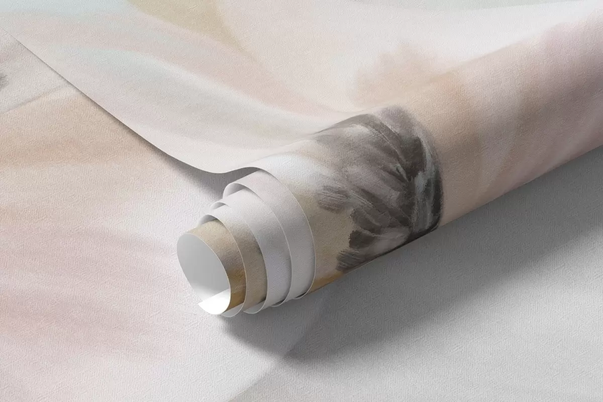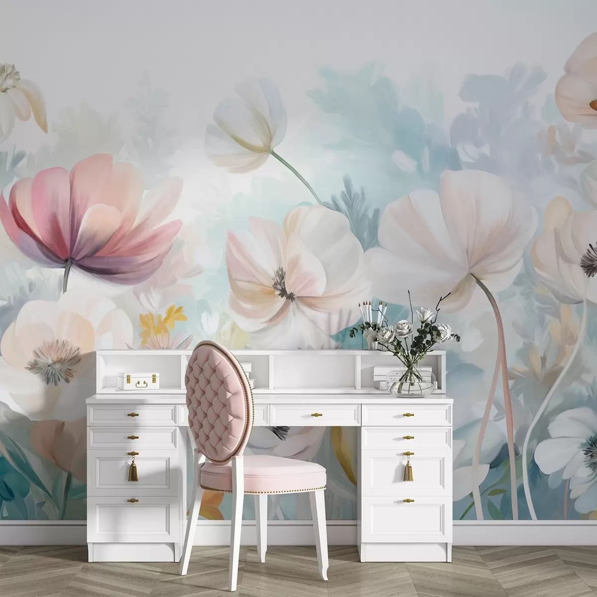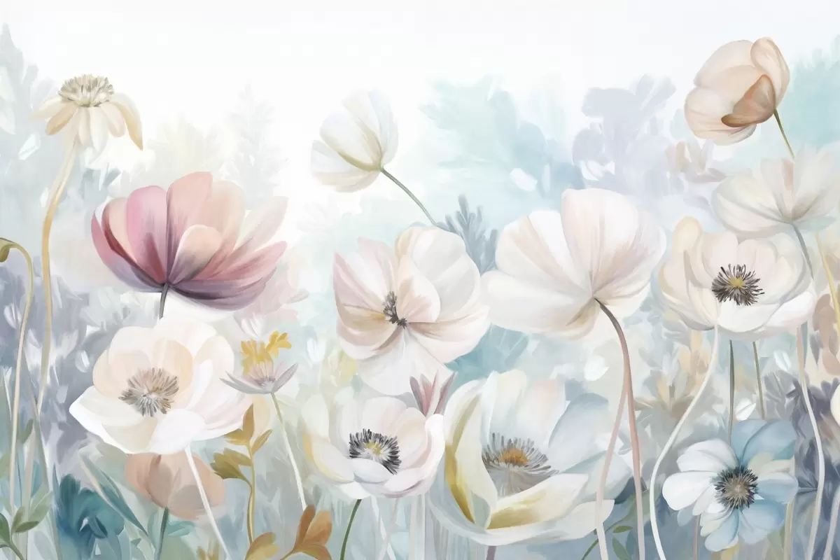 Papel tapiz Un campo de flores en tonos pastel con delicados pétalos y suaves hojas verdes, en un estilo acuarela onírico y texturizado Nr. w09481