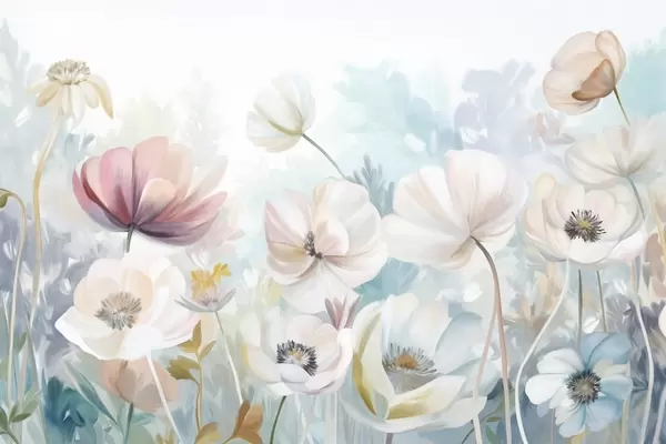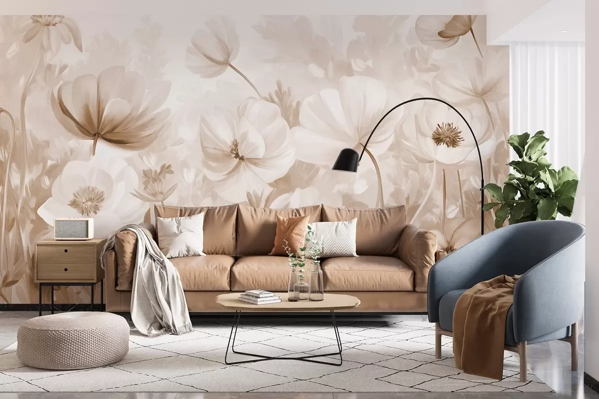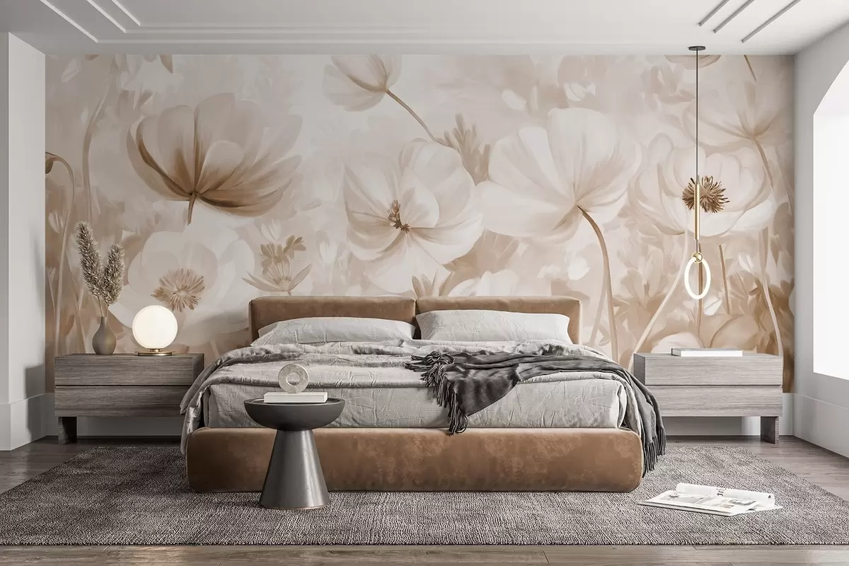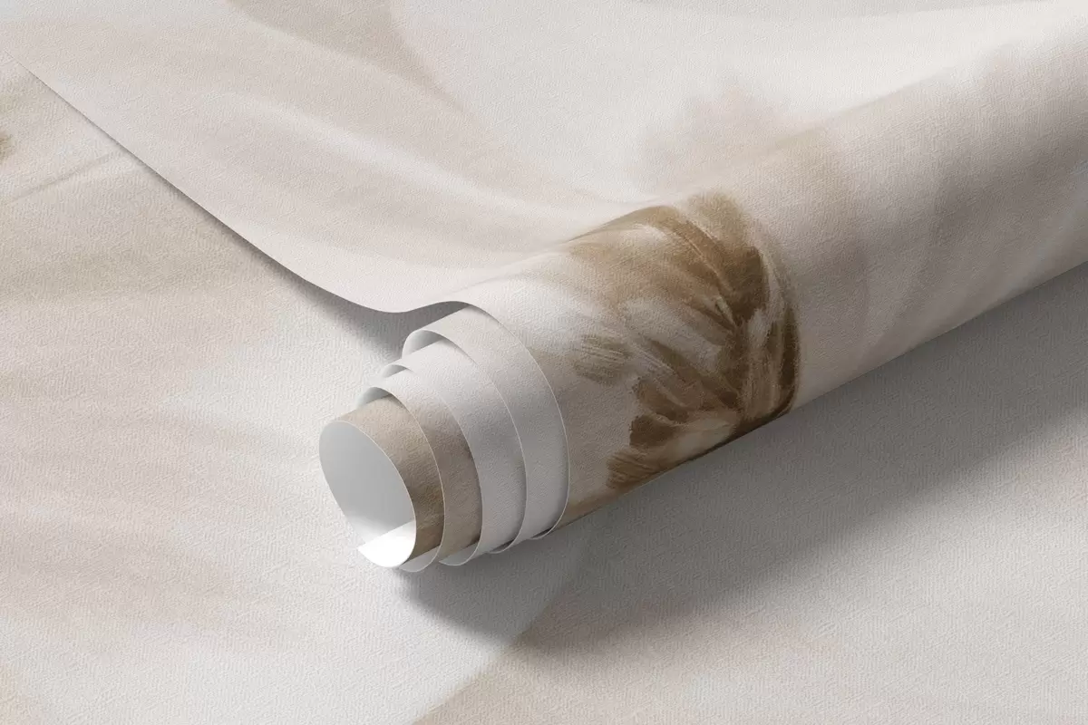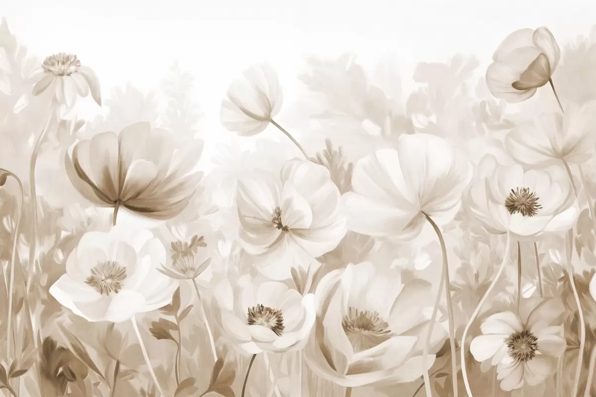 Papel tapiz Un campo de flores beige con delicados pétalos y suaves hojas marrones, en un estilo acuarela de ensueño y texturizado Nr. w09481v1