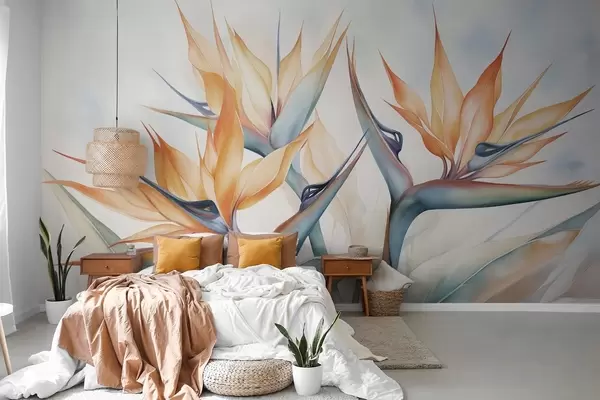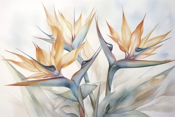 murales de pared Flor del ave del paraíso, strelitzia con pétalos naranjas, estilo texturizado en acuarela suave, fondo claro w09483