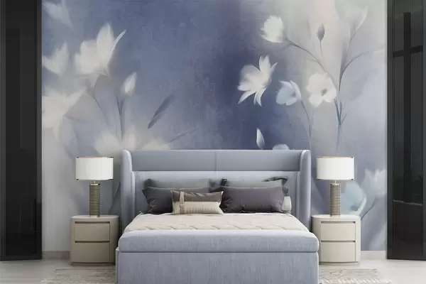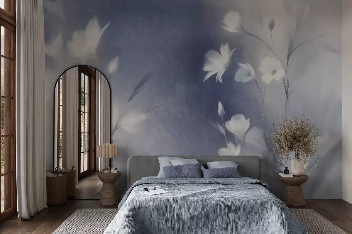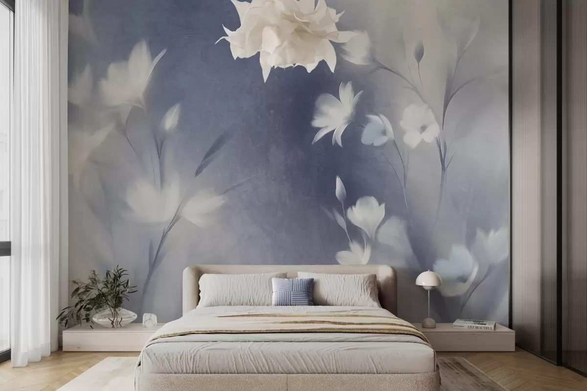 Papel tapiz Flores blancas con textura y tallos largos, capullos suaves sobre un fondo difuminado de tonos azules y blancos Nr. w09484