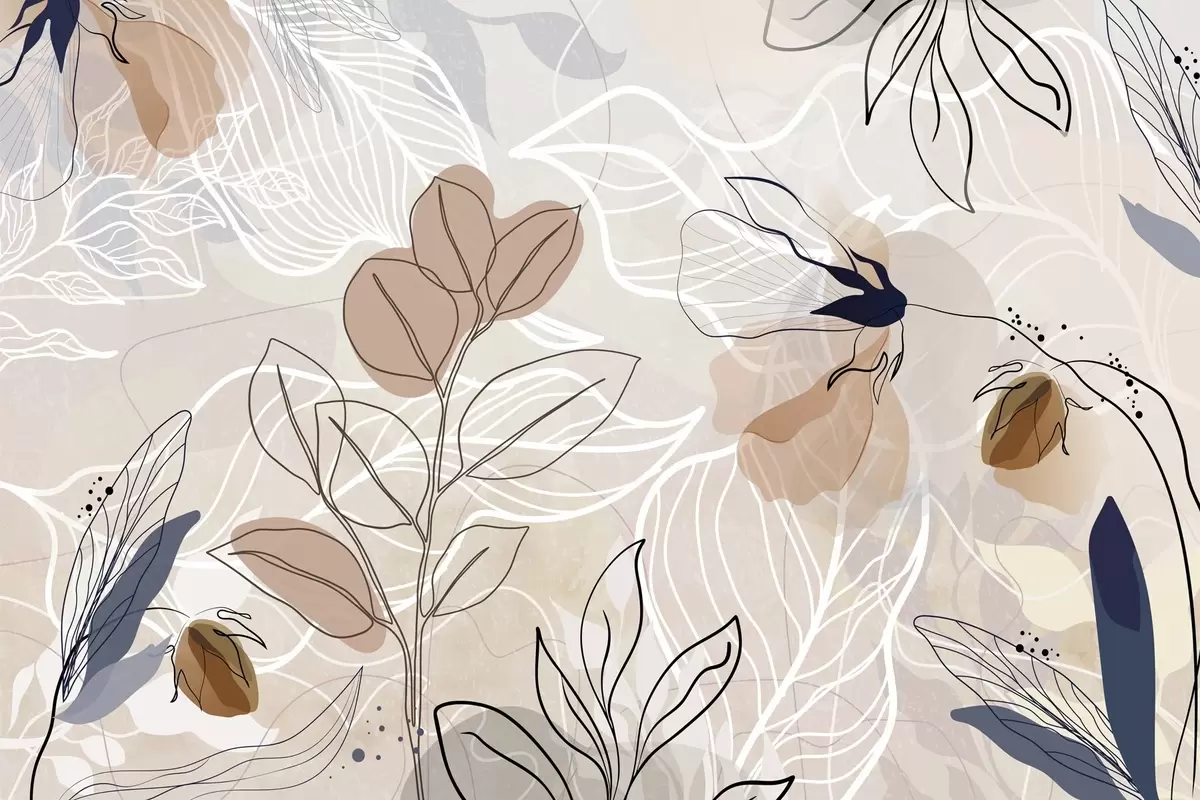 Papel tapiz Fondo abstracto beige con dibujo lineal de hojas y flores, moderno, minimalista, formas orgánicas, estampado botánico Nr. w09487