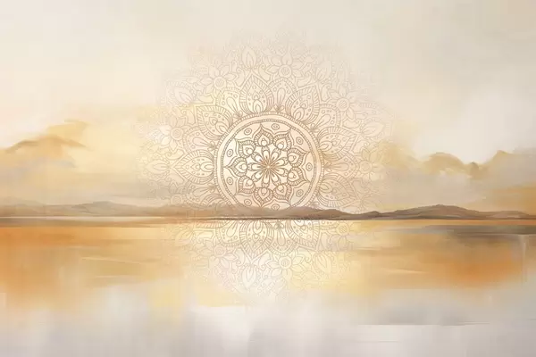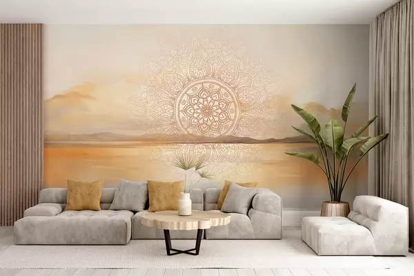 Papel tapiz Diseño mandala simétrico con textura superpuesto a un paisaje con mar, colinas y cielo, en suaves colores pastel. Nr. w09491
