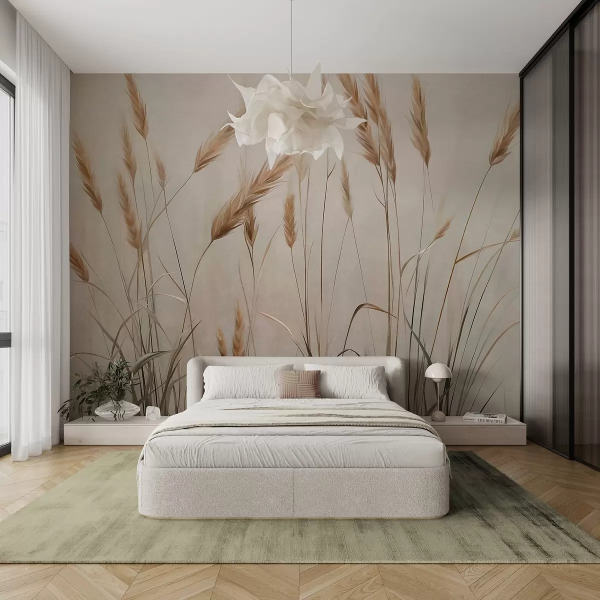murales de pared Campo con textura de trigo con espigas amarillas, fondo beige, iluminación natural, tonos cálidos, pinceladas detalladas w09493