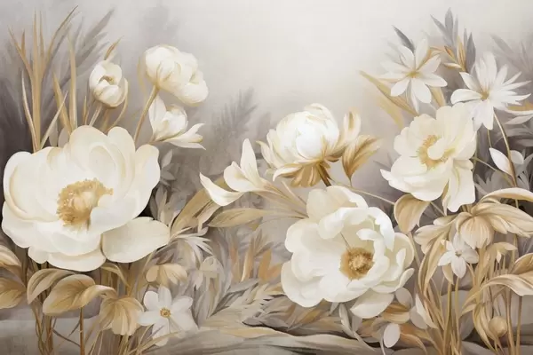 Papel tapiz Peonías blancas y amarillas y otras flores con hierba alta y hojas en un estilo suave y pictórico con textura. Nr. w09494