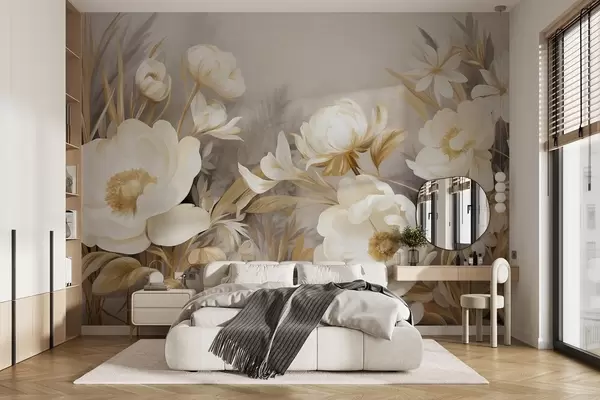 Papel tapiz Peonías blancas y amarillas y otras flores con hierba alta y hojas en un estilo suave y pictórico con textura. Nr. w09494