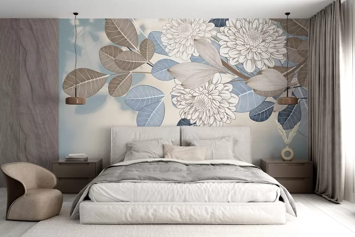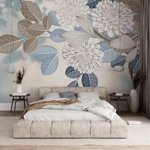 Papel tapiz Flores blancas con hojas azules y marrones, fondo azul claro con textura, arreglo floral, dibujo lineal detallado Nr. w09496