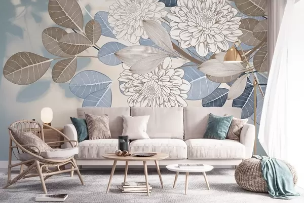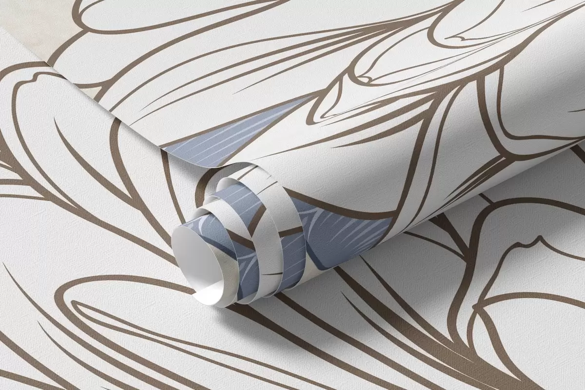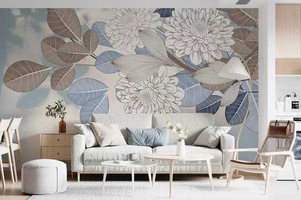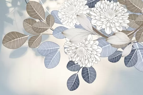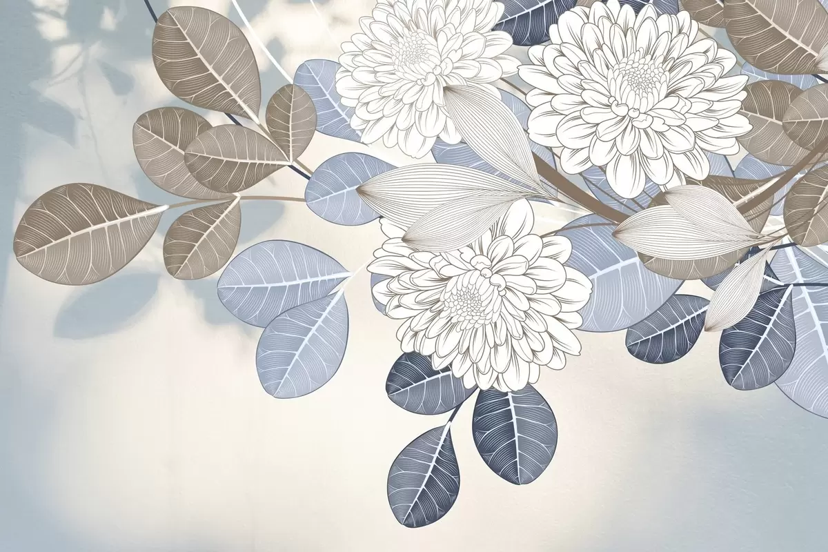 Papel tapiz Flores blancas con hojas azules y marrones, fondo azul claro con textura, arreglo floral, dibujo lineal detallado Nr. w09496