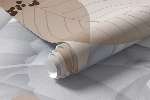 Papel tapiz Flores marrones y hojas grises, fondo botánico floral, diseño elegante, colores suaves, detalles delicados y ligeros Nr. w09497v1