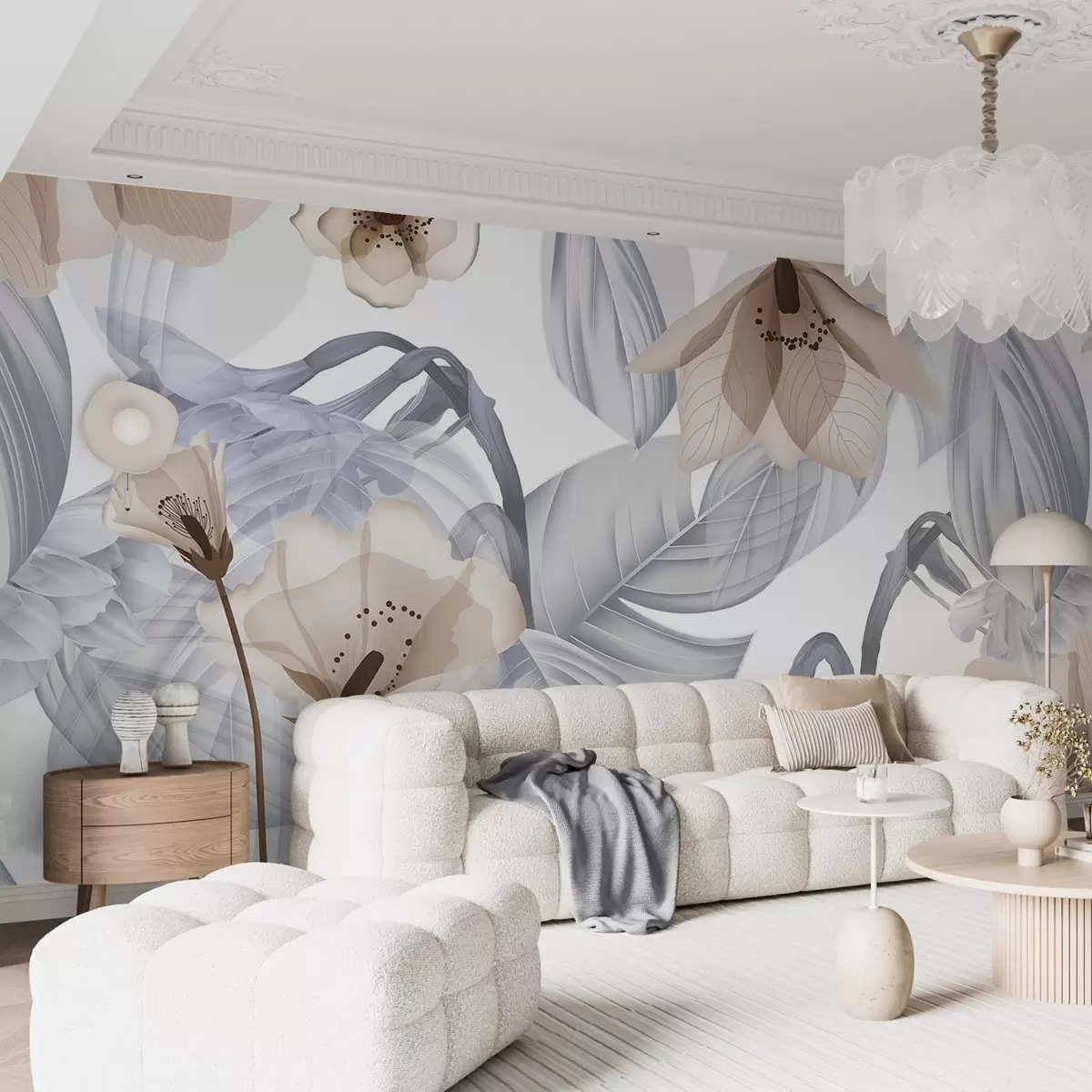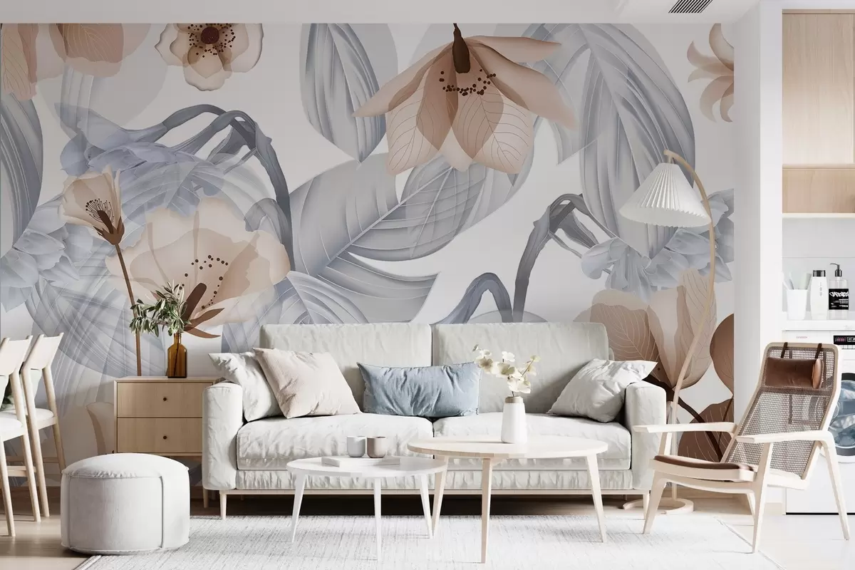 Papel tapiz Flores marrones y hojas grises, fondo botánico floral, diseño elegante, colores suaves, detalles delicados y ligeros Nr. w09497v1