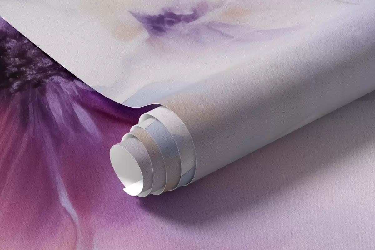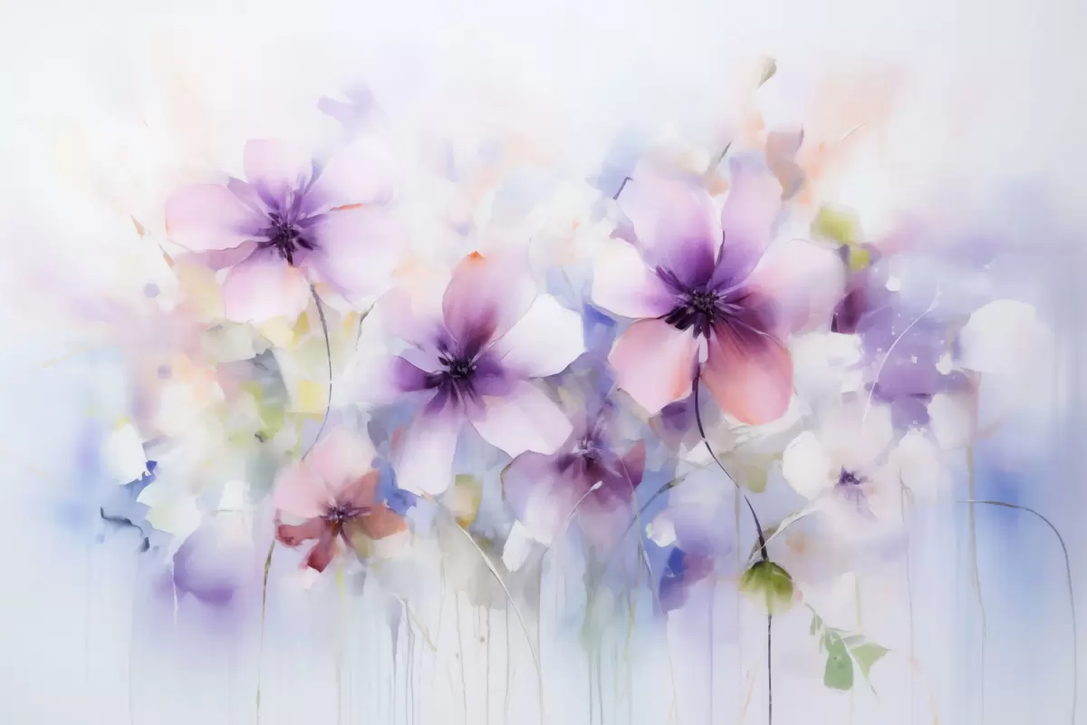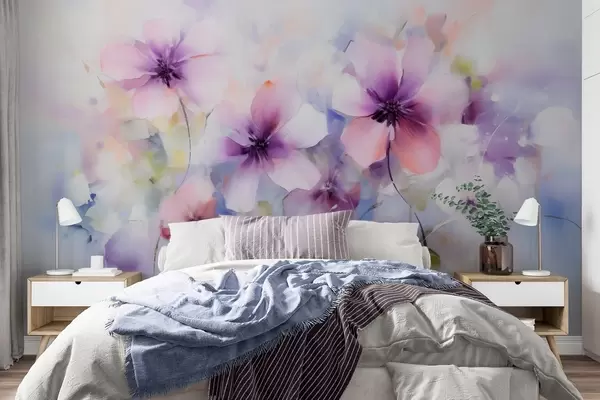 Papel tapiz Flores primaverales en acuarela en tonos rosa y morado. Nr. w09502