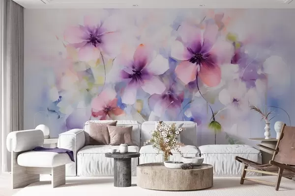 Papel tapiz Flores primaverales en acuarela en tonos rosa y morado. Nr. w09502