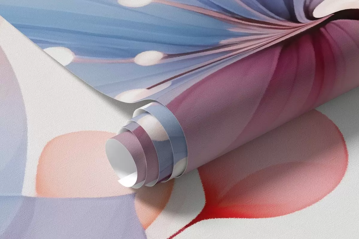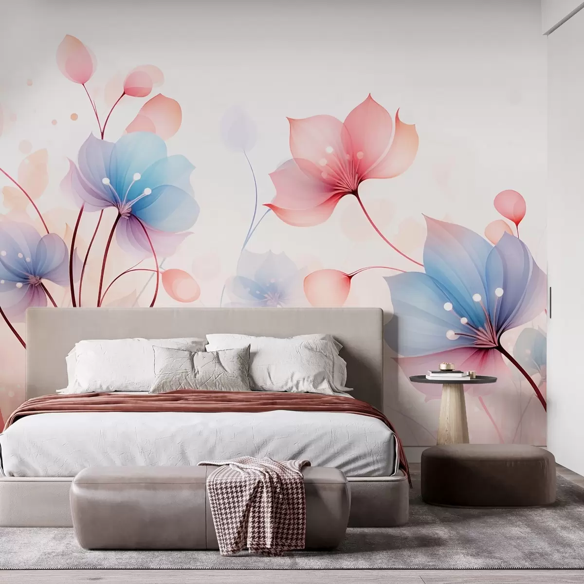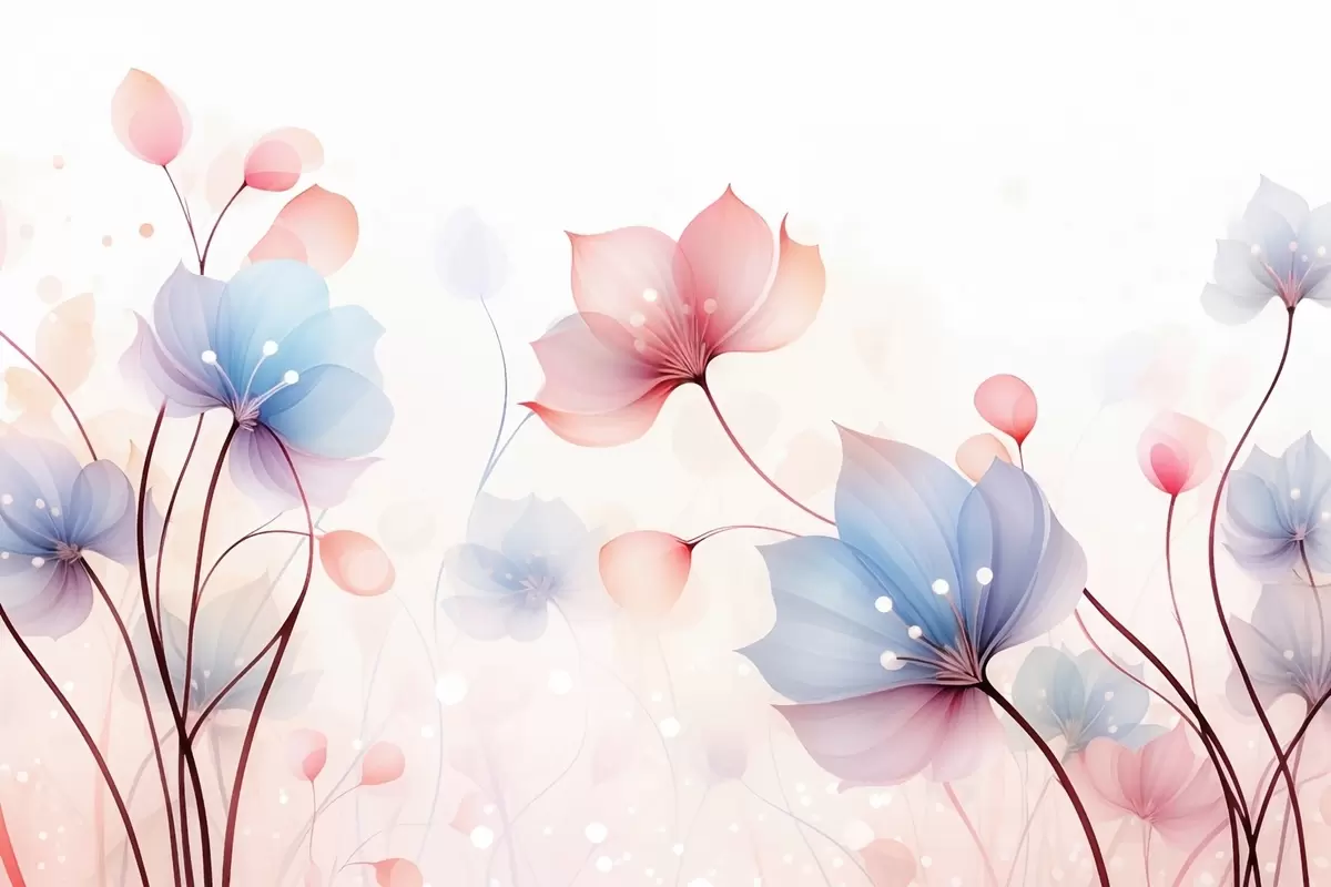 Papel tapiz Delicadas flores rosa y azul: flora etérea sobre un fondo blanco acuarelado. Nr. w09507