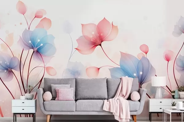 murales de pared Delicadas flores rosa y azul: flora etérea sobre un fondo blanco acuarelado. w09507