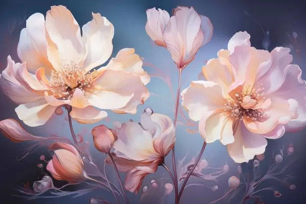 Papel tapiz Peonías aireadas en color rosa crema, pintadas al estilo acuarela sobre un fondo azul intenso. Nr. w09513