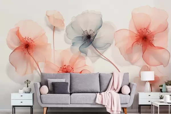 Papel tapiz Flores translúcidas en tonos rojos y azules Nr. w09515