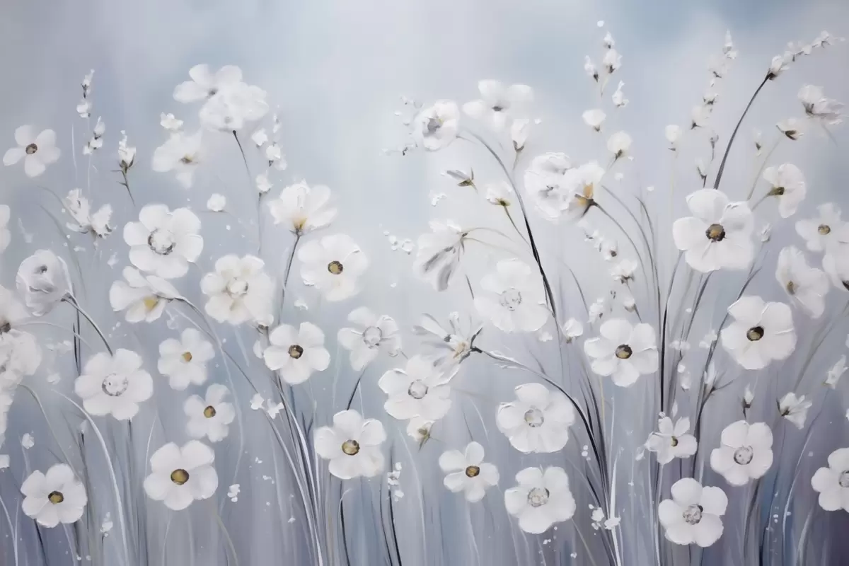 murales de pared Flores blancas contra un cielo azul en estilo pintura al óleo w09516