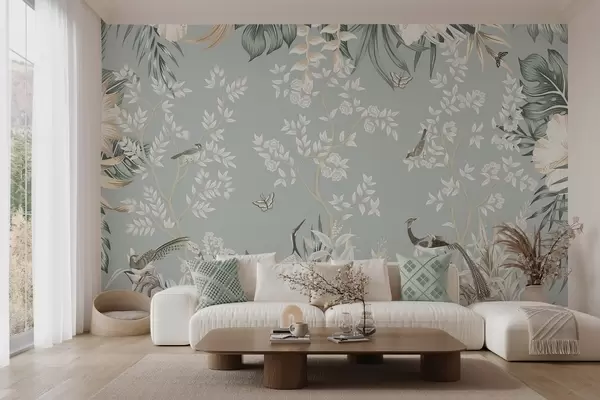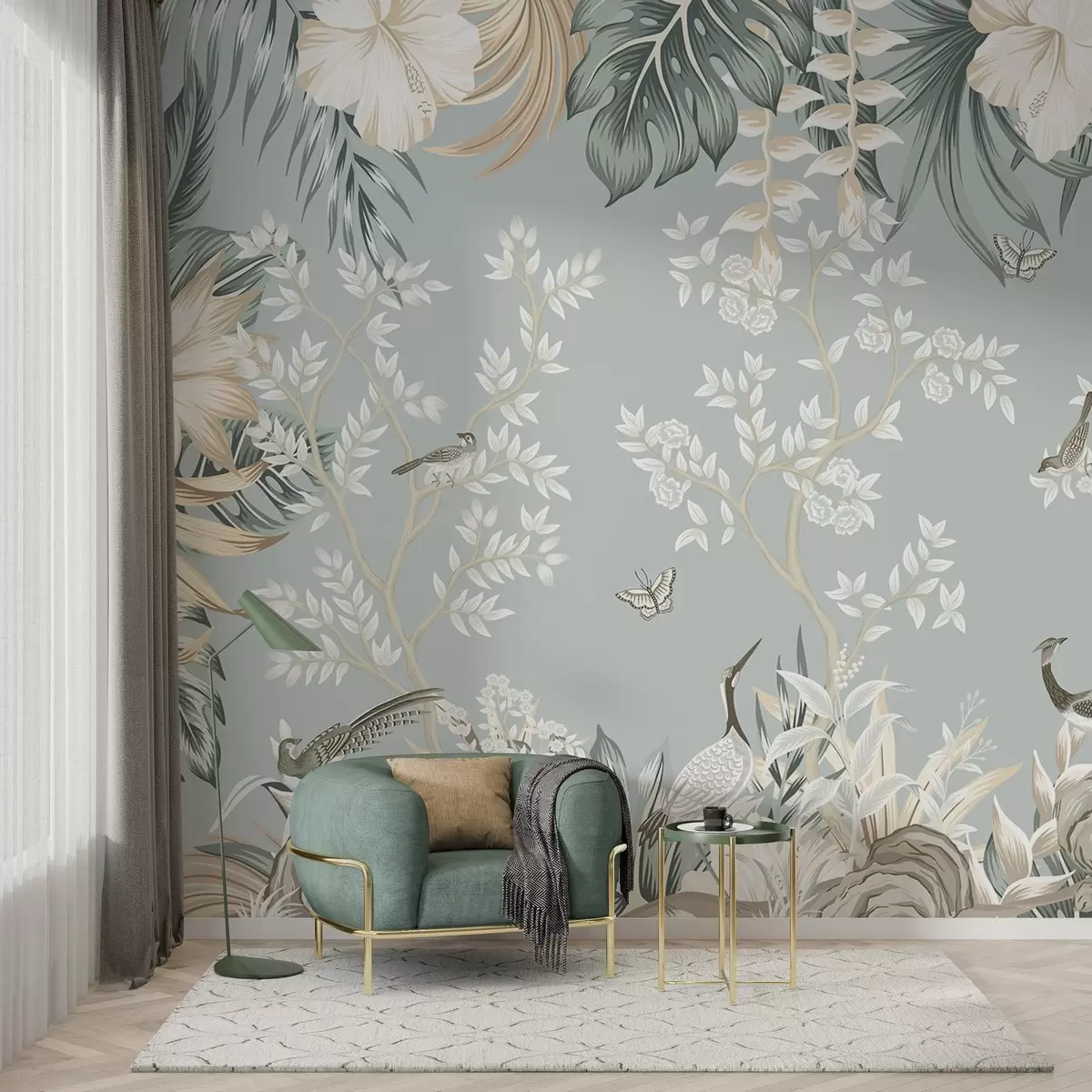 Papel tapiz Arte tropical en tonos pastel con textura, con pájaros, mariposas, flores de hibisco, hojas de palmera y árboles sobre un fondo azul claro Nr. w09528