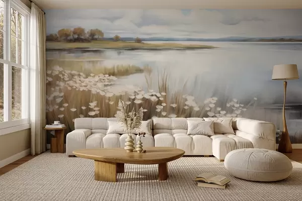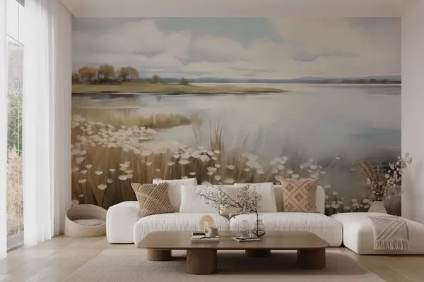 Papel tapiz Paisaje con textura, campo de flores blancas y hierba alta, un lago al fondo, una colina cubierta de hierba con árboles, colores suaves. Nr. w09530