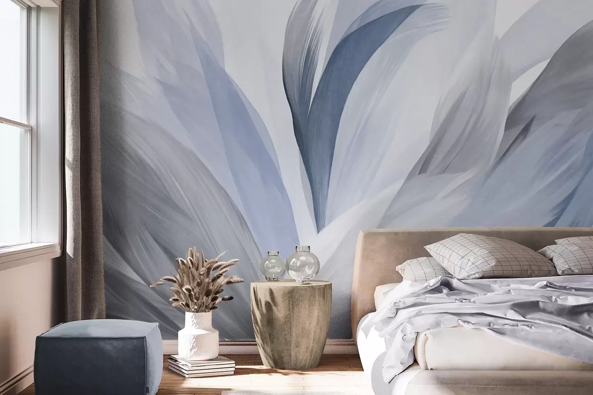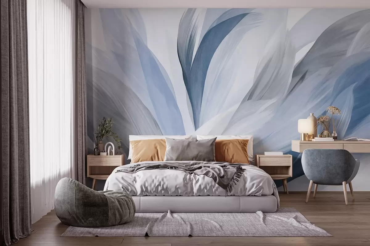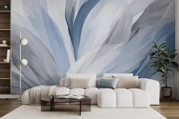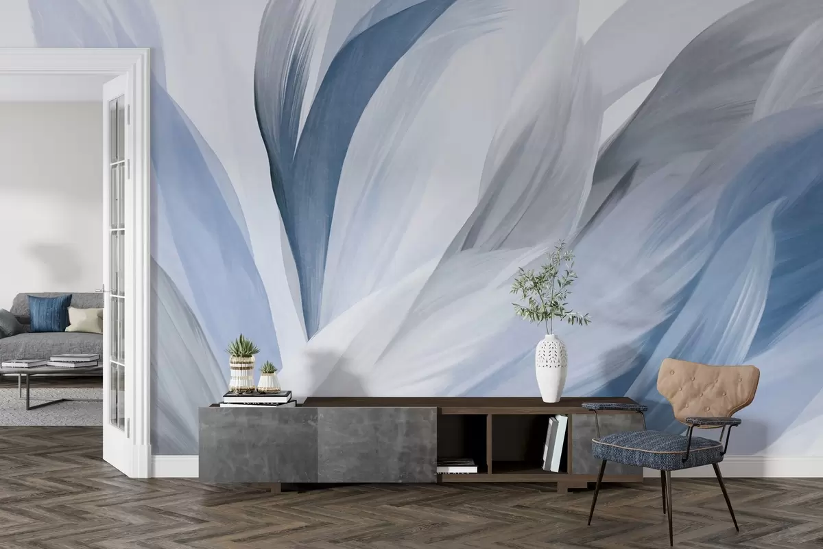 Papel tapiz Plumas abstractas con textura en azul, blanco y gris y varios tonos, superpuestas sobre un fondo blanco. Nr. w09531v1