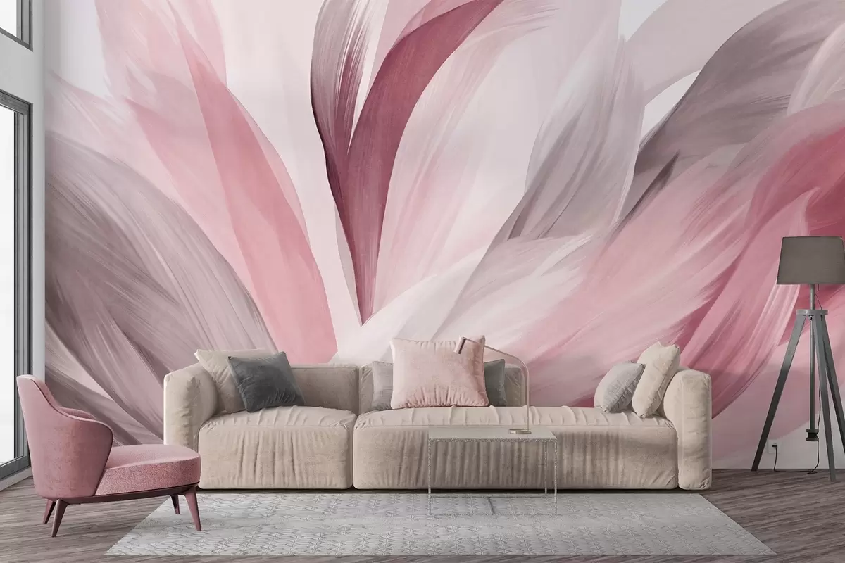 Papel tapiz Plumas abstractas con textura en rosa, blanco y gris y varios tonos, superpuestas sobre un fondo blanco. Nr. w09531v2
