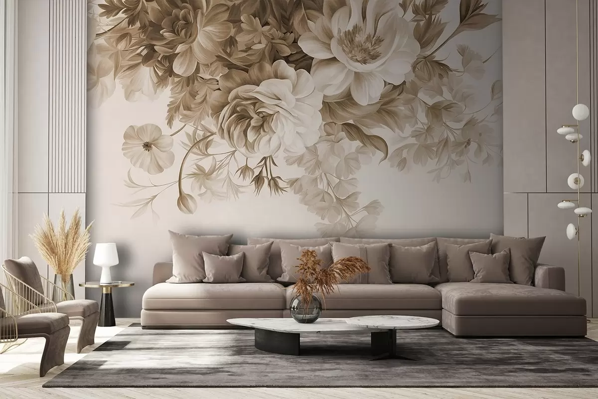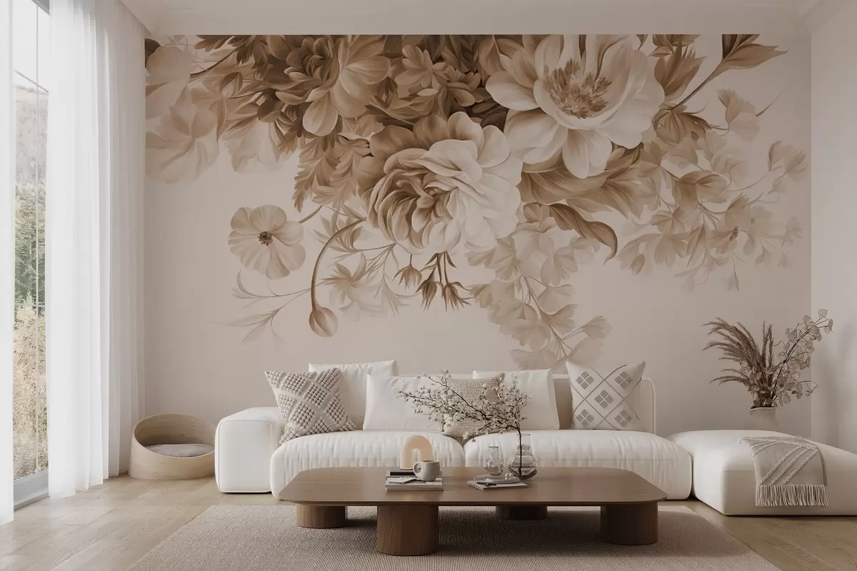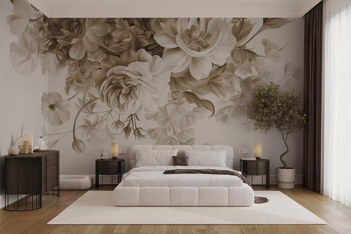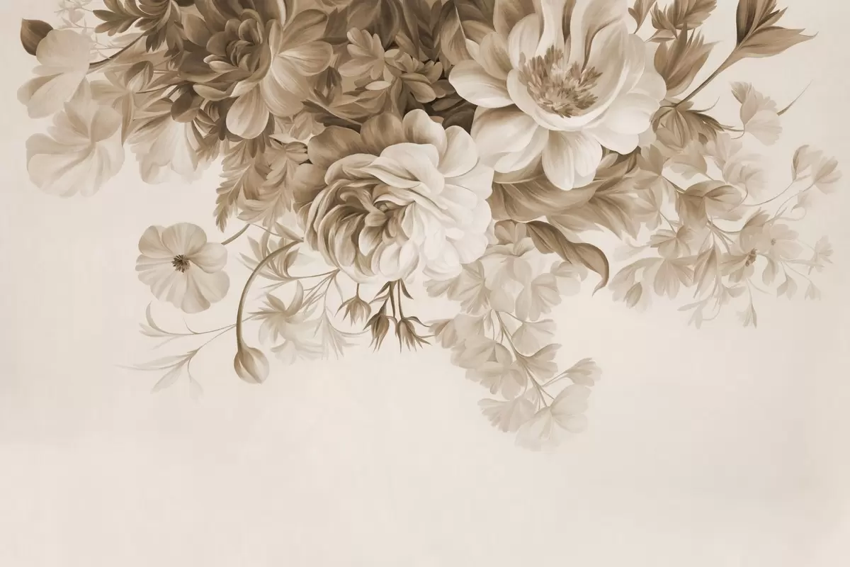 Papel tapiz Arreglo floral vintage con rosas, peonías y otras flores con textura y follaje, sobre un fondo claro. Nr. w09532v1