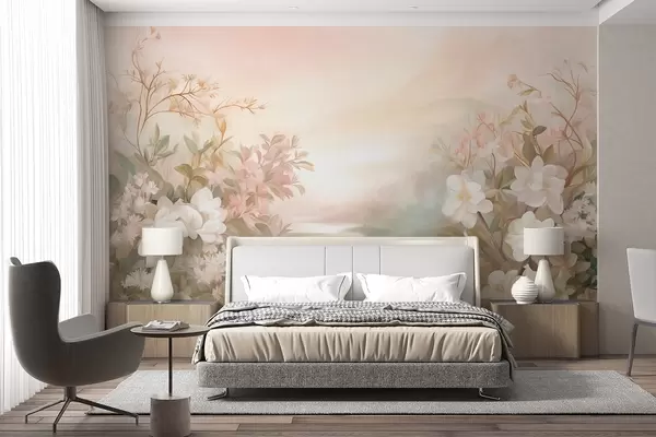 Papel tapiz Un paisaje con un río rodeado de flores y plantas, colores suaves, cielo rosado, estilo con textura de acuarela. Nr. w09537