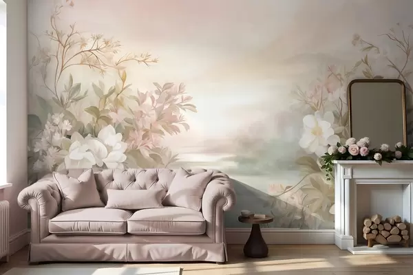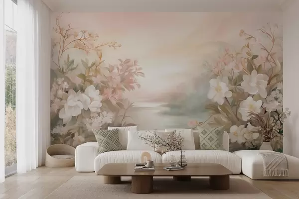 Papel tapiz Un paisaje con un río rodeado de flores y plantas, colores suaves, cielo rosado, estilo con textura de acuarela. Nr. w09537