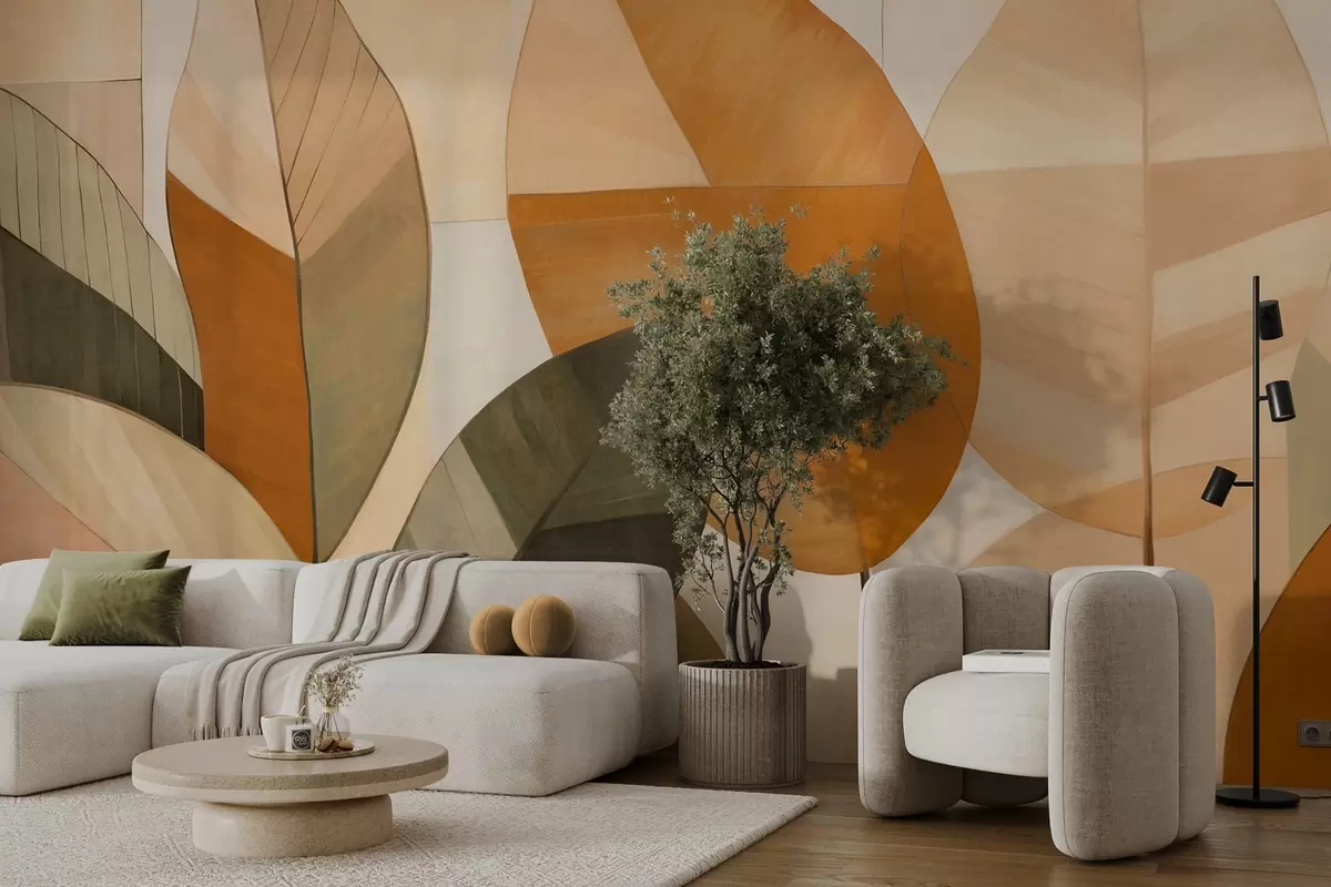 Papel tapiz Hojas abstractas grandes en tonos naranjas, marrones y verdes, con textura, dispuestas sobre un fondo claro. Nr. w09539
