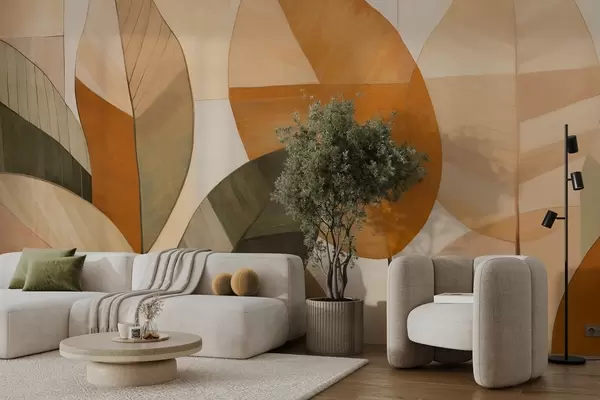 Papel tapiz Hojas abstractas grandes en tonos naranjas, marrones y verdes, con textura, dispuestas sobre un fondo claro Nr. w09539