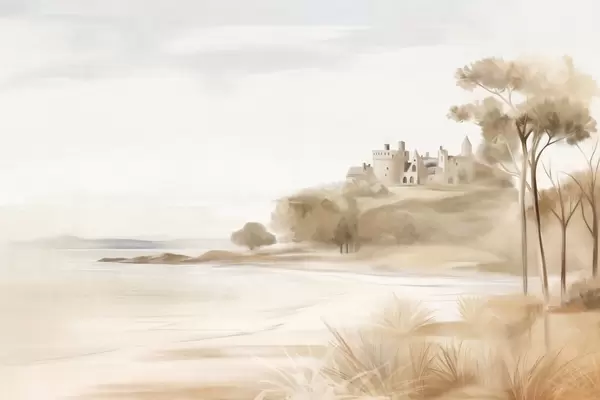 Papel tapiz Paisaje con un castillo en una colina cerca del mar, una playa de arena en primer plano, colores apagados, arte texturizado. Nr. w09540