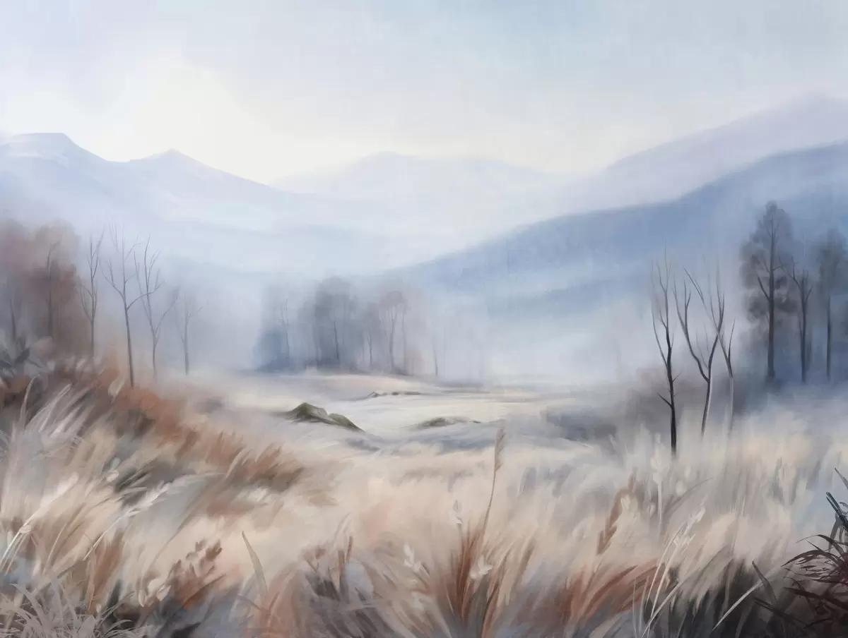 Papel tapiz Paisaje con textura, con hierba seca en primer plano y árboles al fondo, con montañas en la distancia. Nr. w09542