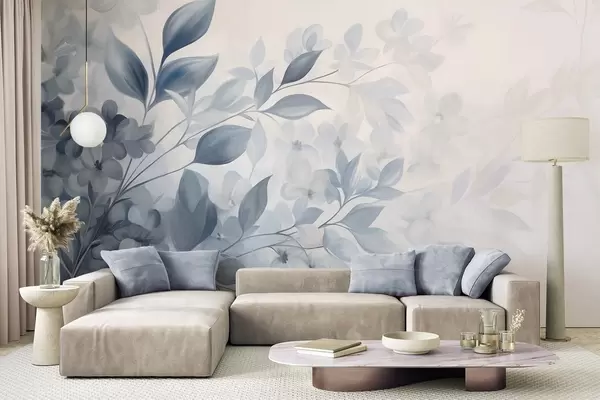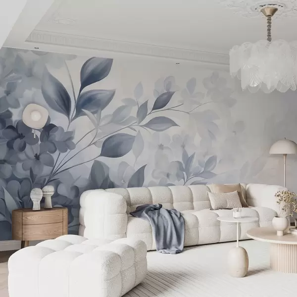 Papel tapiz Rama azul y blanca con textura, con flores y hojas que se desvanecen en un fondo claro, estilo pintura acuarela. Nr. w09543