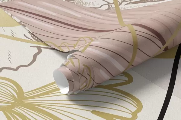 Papel tapiz Estampado floral abstracto con hojas grandes en tonos rosa apagado, amarillo con finas líneas negras y contornos florales blancos. Nr. w09544v1