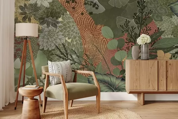 Papel tapiz Collage abstracto con texturas de elementos botánicos, con hojas, flores y texturas orgánicas, en tonos verdes y marrones. Nr. w09545
