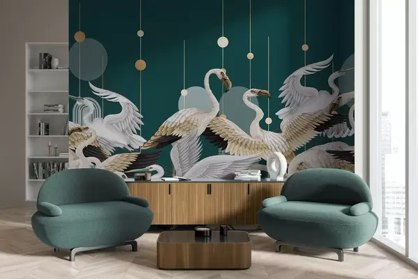 Papel tapiz Una bandada de flamencos blancos con delicadas alas, sobre un fondo verde azulado oscuro con líneas y círculos amarillos Nr. w09546