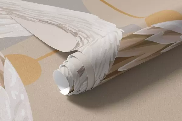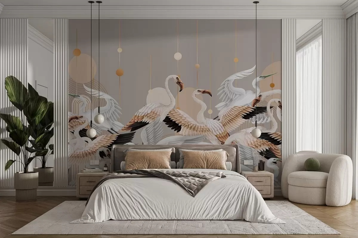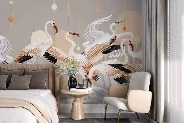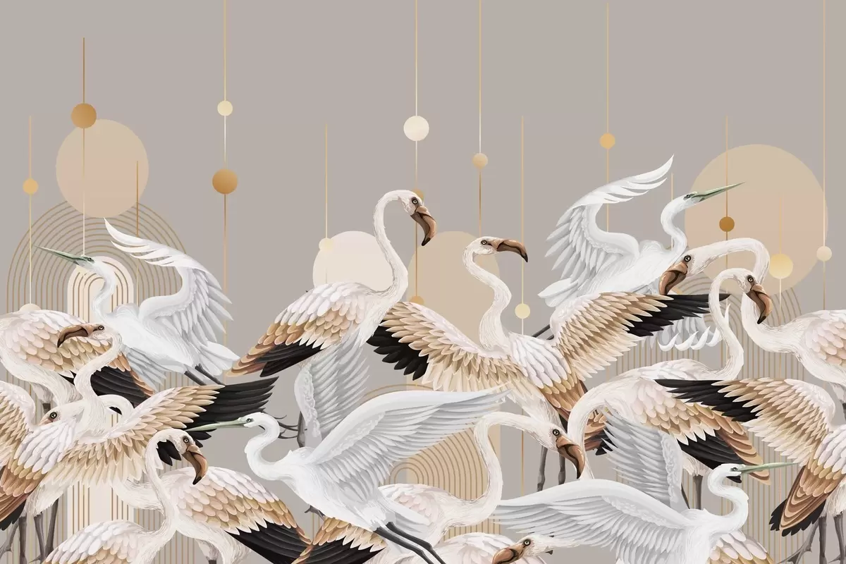 Papel tapiz Una bandada de flamencos blancos con delicadas alas, sobre un fondo neutro con líneas y círculos amarillos. Nr. w09546v1