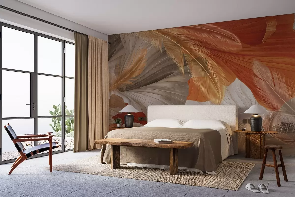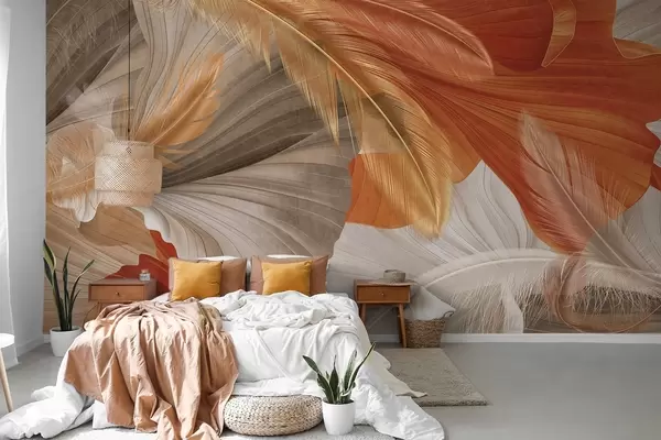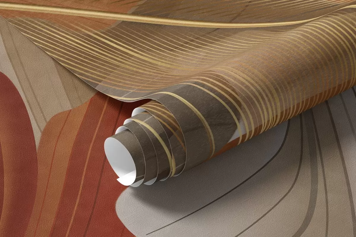 Papel tapiz Formas abstractas grandes y fluidas con textura en colores crema y óxido con delicadas plumas amarillas, beige y marrones. Nr. w09549