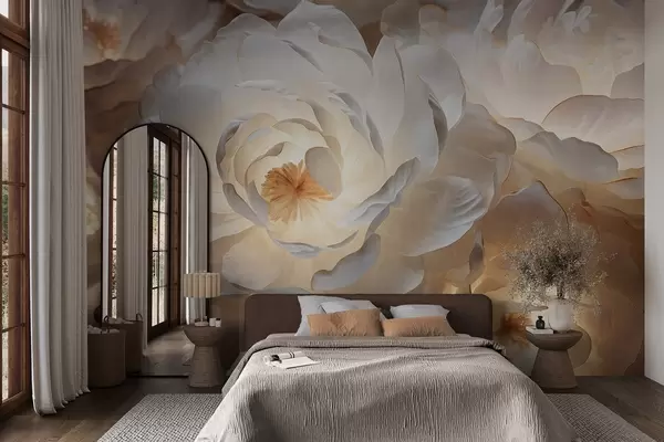 murales de pared Grandes flores de peonía blancas con centros amarillos, iluminación suave y pétalos delicados con textura en capas. w09550