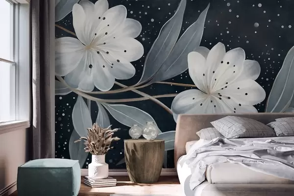 Papel tapiz Flores blancas con textura fantástica, rodeadas de hojas y ramas azul verdosas sobre un fondo oscuro. Nr. w09551