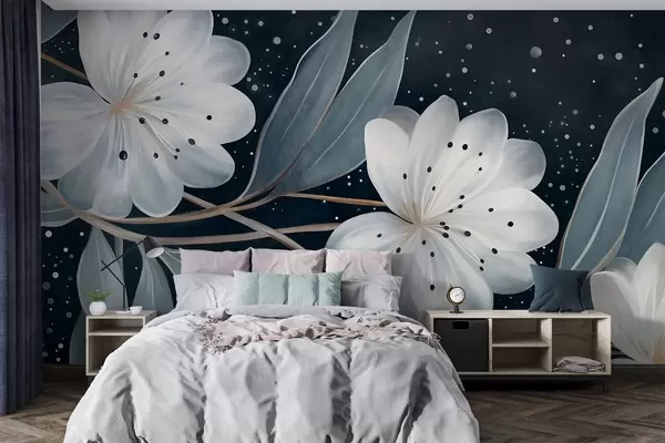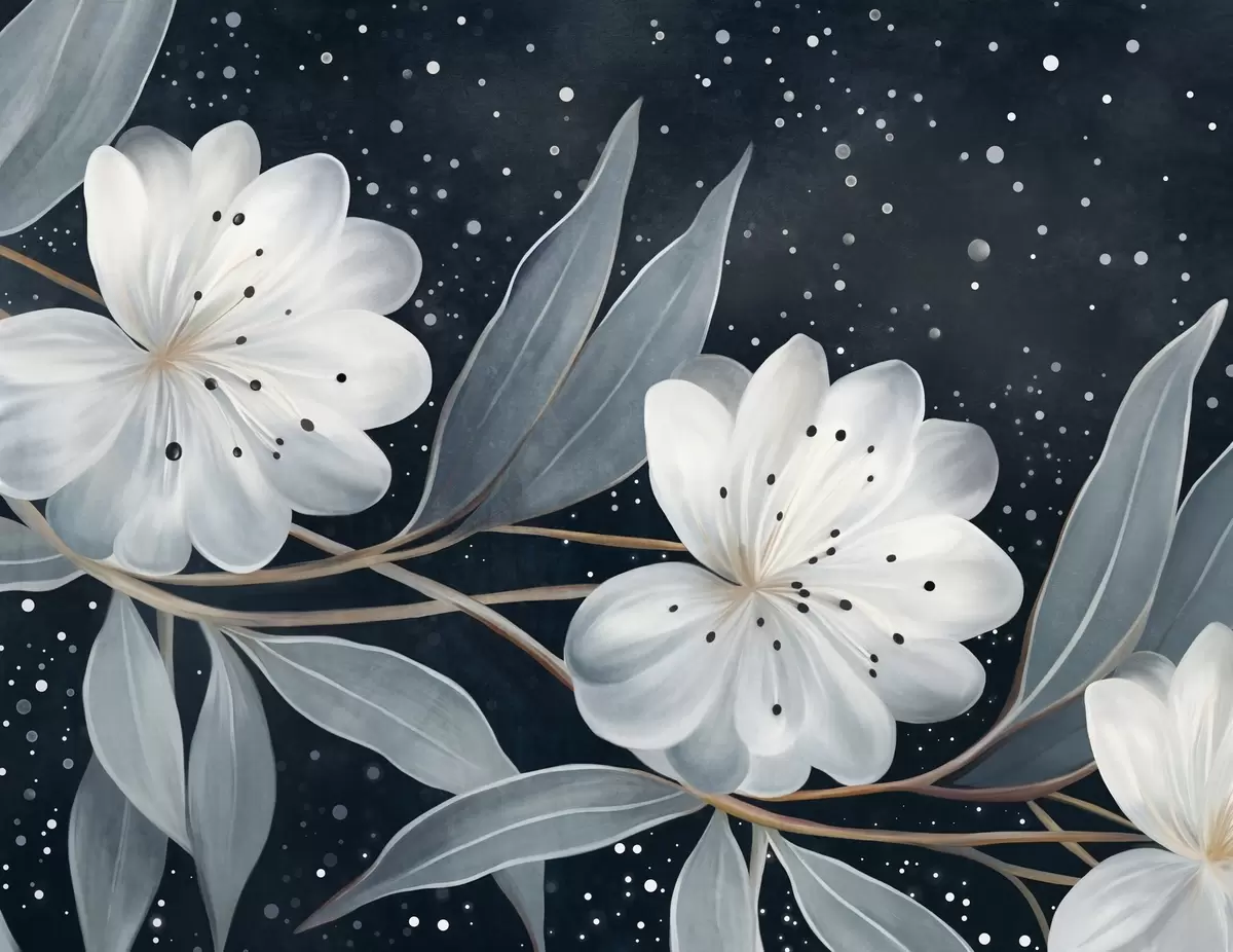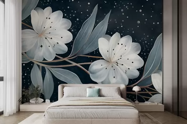 Papel tapiz Flores blancas con textura fantástica, rodeadas de hojas y ramas azul verdosas sobre un fondo oscuro. Nr. w09551