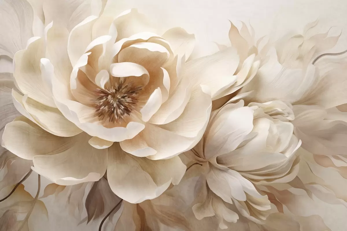 Papel tapiz Peonías de textura cremosa con centros marrones y hojas sobre un fondo abstracto difuminado y claro. Nr. w09554
