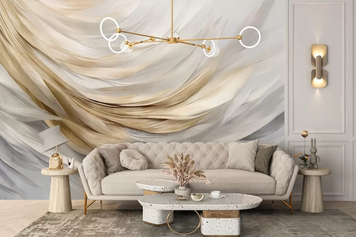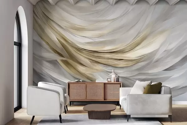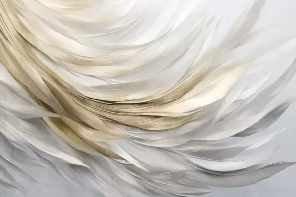 Papel tapiz Plumas abstractas con textura en blanco, gris y amarillo, creando un patrón fluido y en capas sobre un fondo claro. Nr. w09557