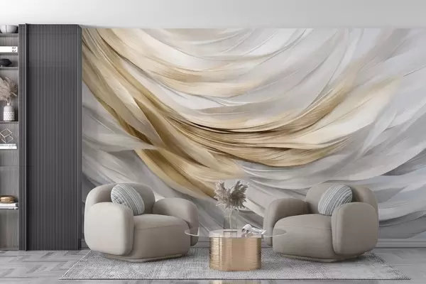Papel tapiz Plumas abstractas con textura en blanco, gris y amarillo, creando un patrón fluido y en capas sobre un fondo claro Nr. w09557