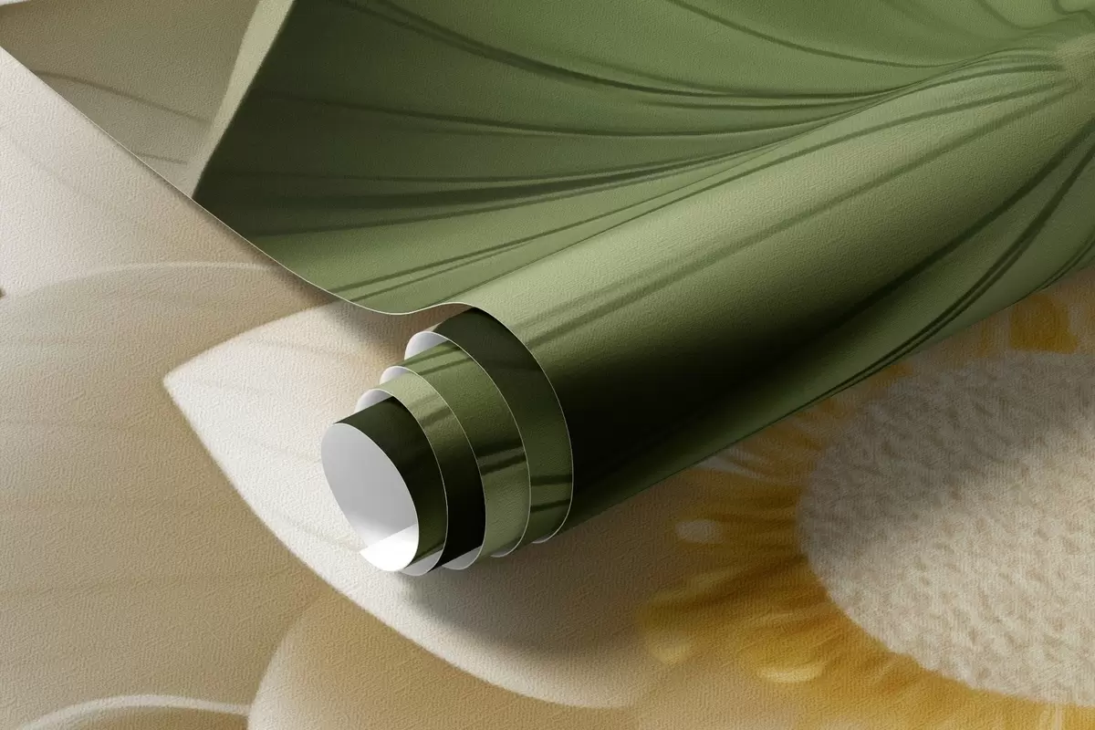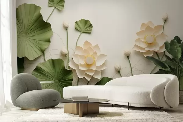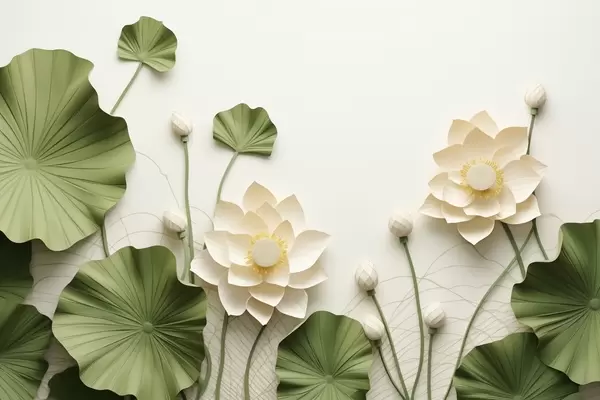 Papel tapiz Flores de loto en 3D con hojas verdes texturizadas, estilo minimalista. Nr. w09560