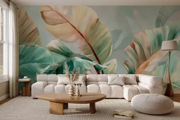 Papel tapiz Delicadas hojas tropicales de plátano en tonos pastel amarillo verdosos. Nr. w09581