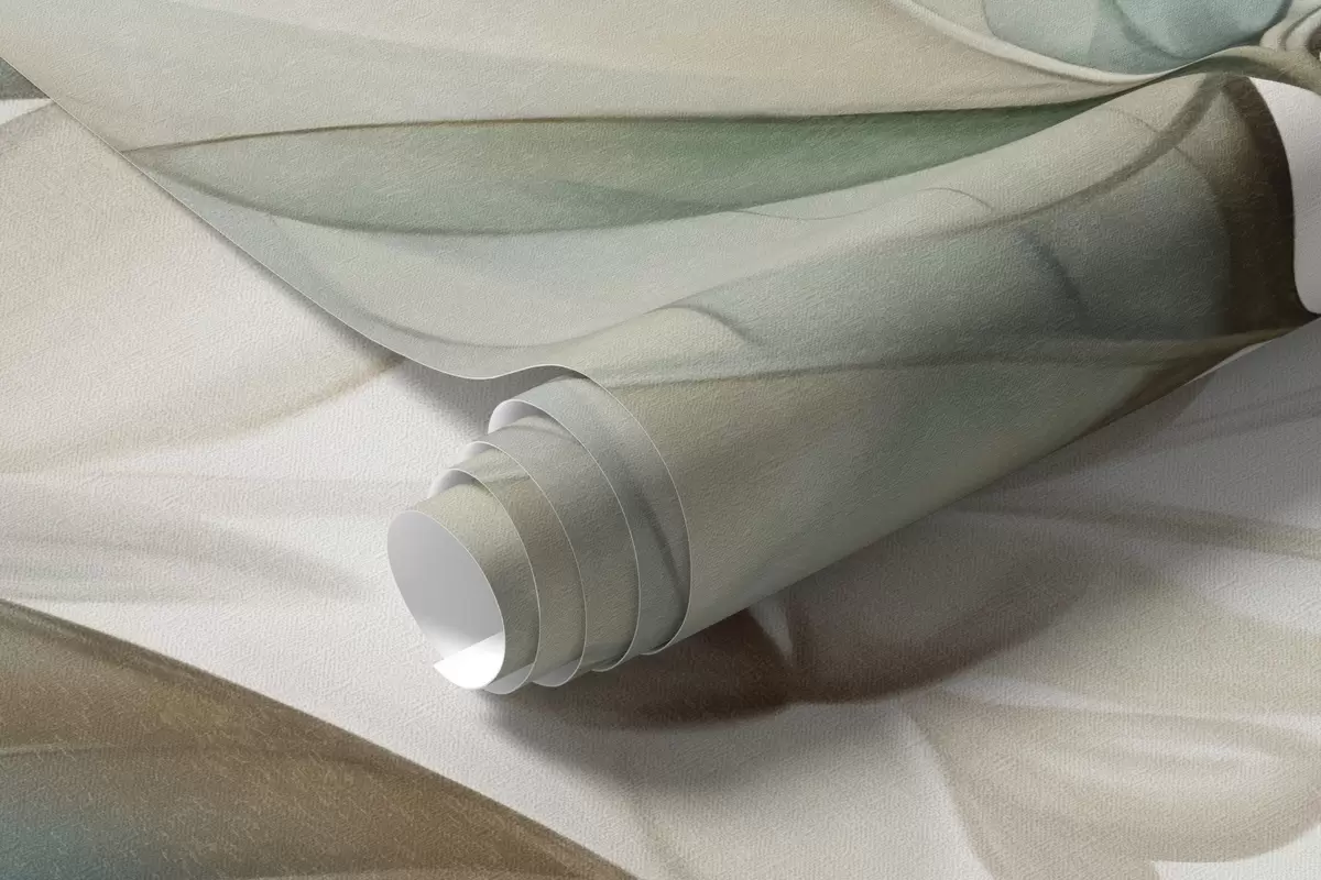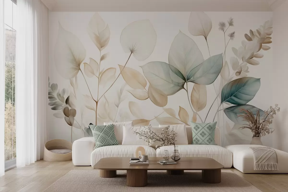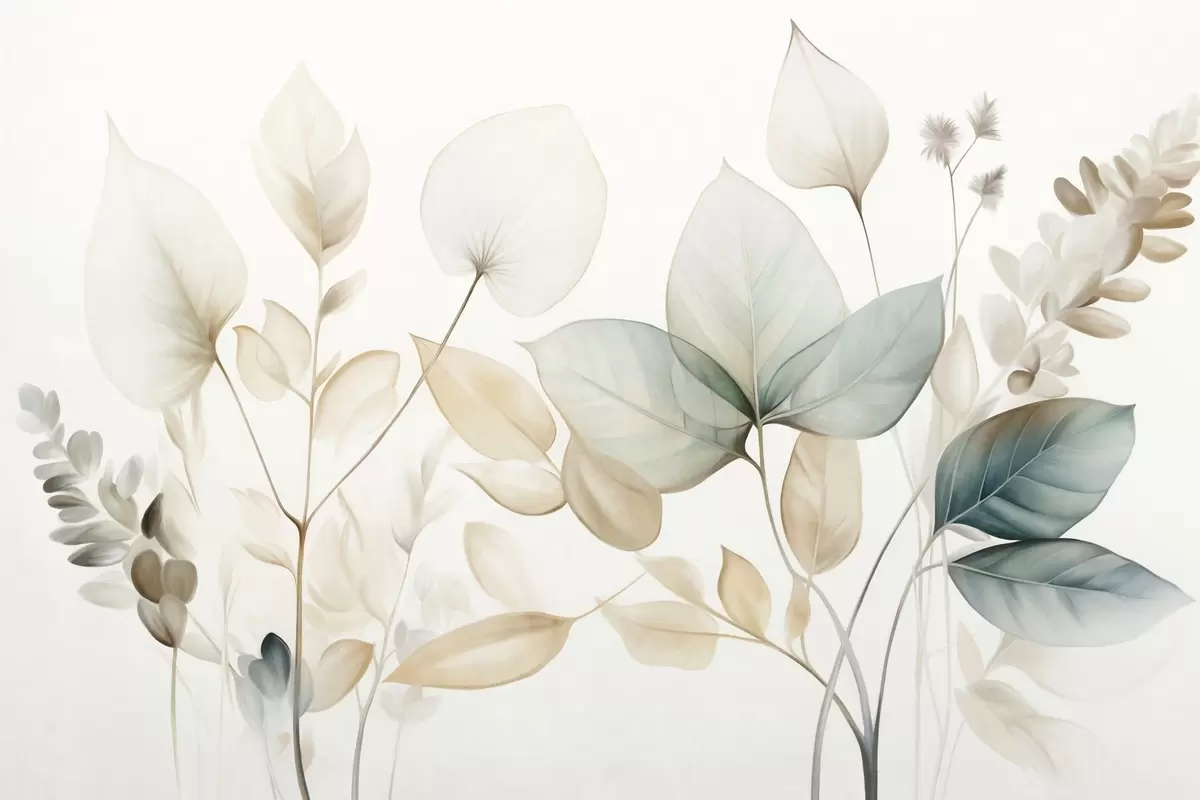 Papel tapiz Hojas translúcidas con textura en tonos apagados de beige y verde azulado, con tallos delicados sobre un fondo suave y claro. Nr. w09583