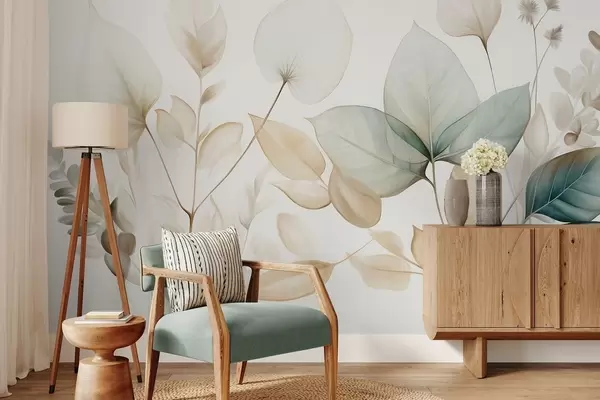 Papel tapiz Hojas translúcidas con textura en tonos apagados de beige y verde azulado, con tallos delicados sobre un fondo suave y claro Nr. w09583